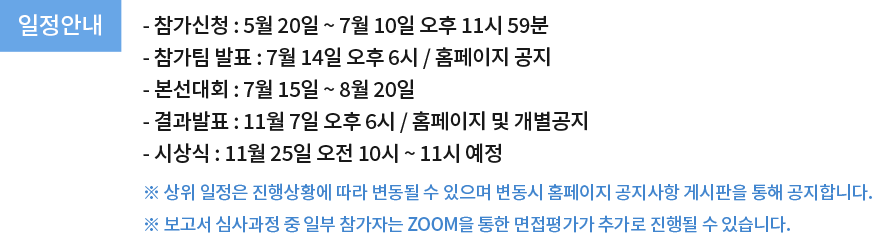 - 공지된 대회 내용은 주최측의 운영사정에 따라 다소 변경될 수 있으며, 변경 시 홈페이지를 통해 공지함.