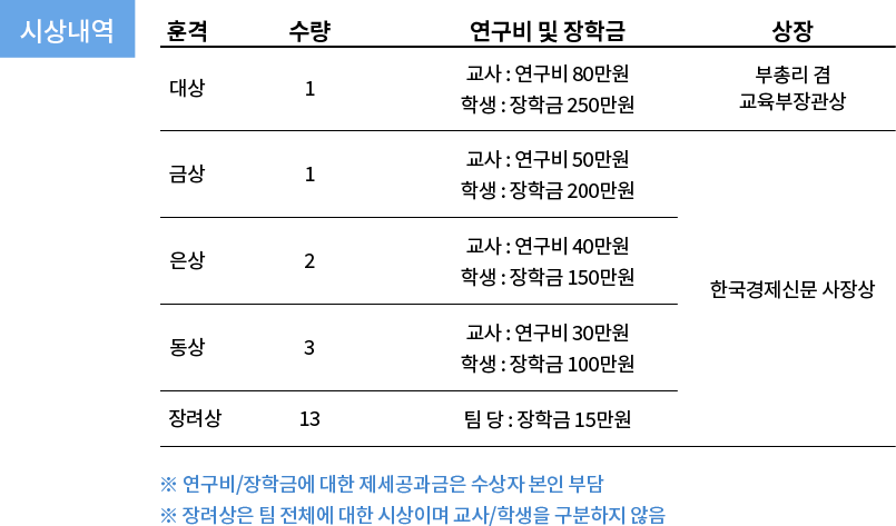 - 장려상 상금의 경우 해당 팀의 담당 지도교사에게 지급함.